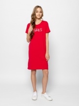 Girls' T-shirt dress with a straight cut, crew neck, above-the-knee length, and large brand logo on the front. Material: 95% cotton, 5% elastane, single jersey.