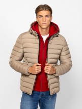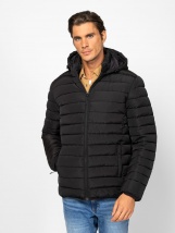 Men's quilted hooded jacket with soft shiny finish, straight comfortable fit, adjustable detachable hood, zipped inside and outside pockets, small metal branding on sleeve. Materia