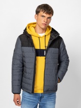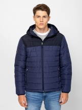 Men's quilted hooded jacket with a comfortable sporty cut and colours, fixed hood, inner wind flap, zipped pockets, zipped inner pocket, small brand logo on sleeve. Material: shell