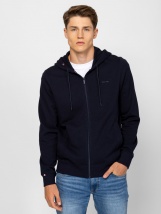 Men's zip-up hoodie with classic fit, straight pockets, ribbed trim at bottom and front, and small branding on front, hood, bottom of sleeve, and back. Material: 54% cotton, 38% polyester, 8% viscose, pique. The model is 188 cm tall and wears size L.