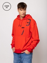 Men's overhead hoodie with loose sporty fit, kangaroo pockets, ribbed trim at cuffs and bottom, printed branding on front and back, small branding on side. Material: 72% cotton, 28