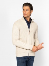 Men's zip-up knitted cardigan in basic colours, classic cut, pure cotton fabric, ribbed knit collar, front and bottom, small metal and leather branding at the bottom front. Materia