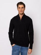 Men's knit sweater with classic cut, basic colours, zip stand-up collar, rib knit collar, cuffs and bottom, small woven branding at the front bottom. Material: 100% cotton, knitted