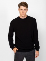 Men's knit sweater with classic cut, stylish knit pattern, crew neck, ribbed knit cuffs, neck and bottom, small leather branding at the bottom front. Material: 100% cotton, knitted fabric. The model is 188 cm tall and wears size L.