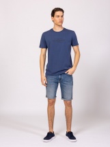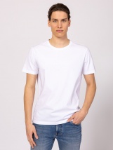 Men's short-sleeved T-shirt with straight cut, crew neck, large printed tone-in-tone branding on the front. Material: 100% cotton, single jersey. The model is 188 cm tall and wears size L.