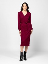 Women's fine knit dress with a feminine silhouette, below the knee length, v-neck, belted waist, small metallic branding on the back. Material: 75% viscose, 25% nylon, knitted fabr