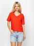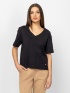 Women's short-sleeve T-shirt with a boxy cut and V-neck. Elbow-length sleeve, with a small brand logo on the front. Material: 100% cotton slub jersey. The model is 175 cm tall and wears a size S.