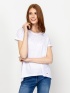 Women's short-sleeved T-shirt with a loose fit, crew neck, dropped shoulders, and front stone decoration. Material: 50% cotton, 50% modal single jersey. The model is 175 cm tall and wears a size S.