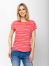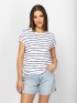Women's short-sleeve T-shirt with a loose fit, crew neck, and dropped shoulders. Made from striped fabric with a drawstring side seam and a small brand logo on the back. Material: