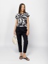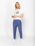 Women's long pants with straight legs, comfort fit cut, folded hem, and crease. With front pockets, fake back pocket, and elastic waistband. Material: 63% polyester, 32% viscose, 5% elastane. The model is 175 cm tall and wears size S.