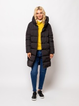 Women's quilted winter coat with wider cut, knee-length, fixed hood, in-line pockets, hidden patent fastening, made of moderately water-repellent fabric, small metal branding on sl