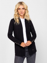 Women's fine knit cardigan, with an elegant scarf collar neck, decorative button cuffs and small metal branding on the front. Material: 83% viscose, 17% nylon, knitted fabric. The