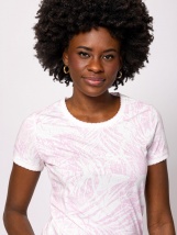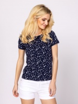 Women's short-sleeved T-shirt with a slightly slim fit, round neckline, summer-inspired patterns, small metallic branding at the bottom, made of pure cotton fabric. Material: 100% cotton, single jersey. The model is 175 cm tall and wears size S.