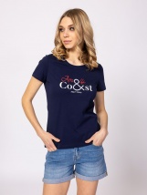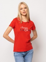 Women's short-sleeved T-shirt with a slightly slim fit, round neckline and printed mitre on the front. Fabric: 100% cotton, single jersey. The model is 175 cm tall and wears size S