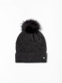 Women's knitted hat with pearl decoration, small metal brand logo on the side, decorative pompom. Material: 74% acrylic, 22% polyester, 4% elastane.