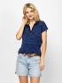 Women's polo shirt with a looser fit, V-neck, made from patterned material. Material: 50% cotton, 50% viscose, single jersey. The model is 175 cm tall and wears a size S.