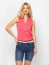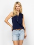 Women's sleeveless top with a looser fit, buttoned, stand-up collar, and patterned fabric. Material: 50% cotton, 50% viscose single jersey. The model is 175 cm tall and wears a siz
