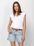 Women's sleeveless top with a looser fit, V-neck, shoulder pads, and pleats. Material: 50% cotton, 50% modal single jersey. The model is 175 cm tall and wears a size S.